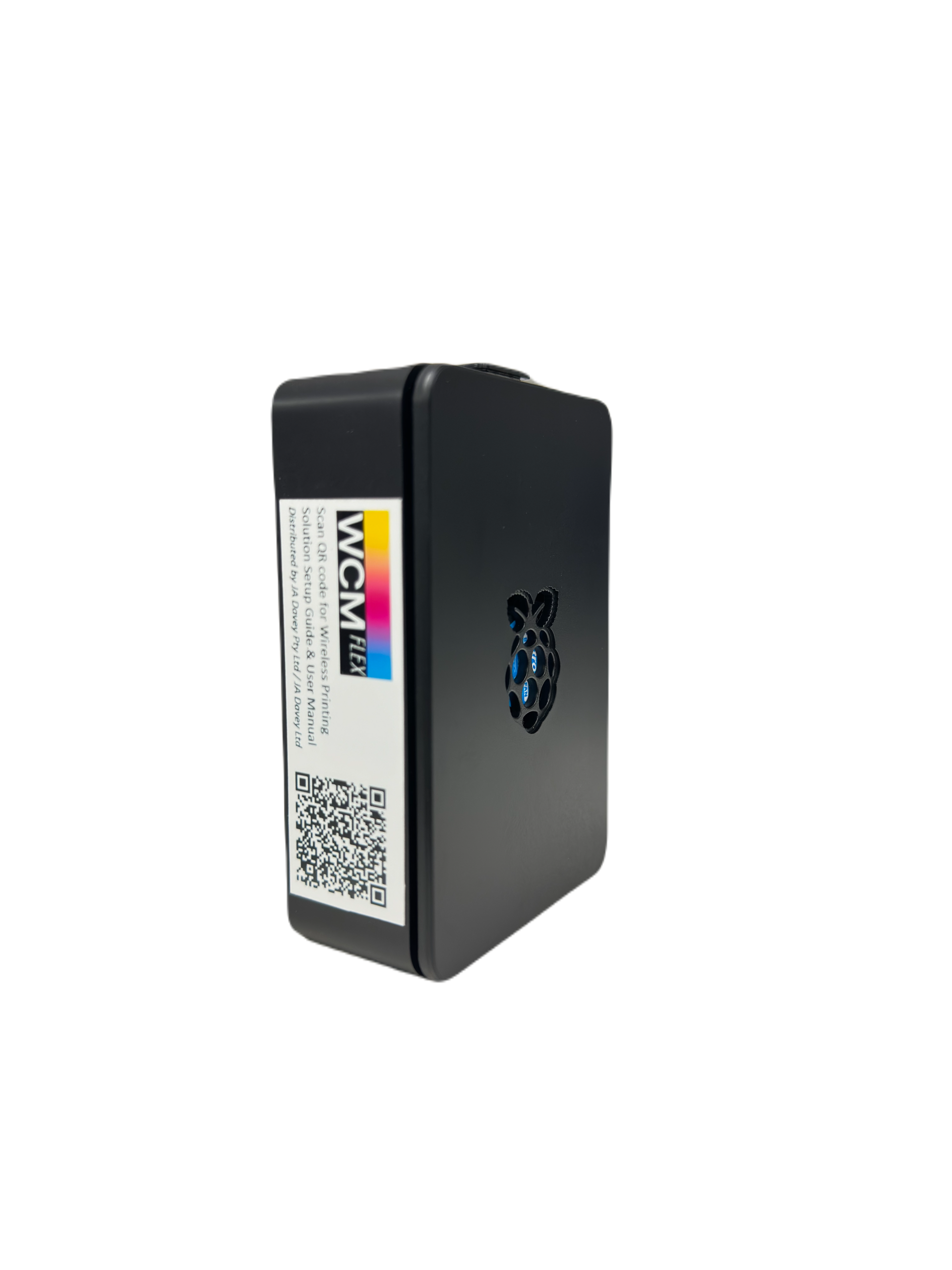 WCM Flex is a licensed software packaged that, when installed on a Raspberry Pi 4 Model B micro computer, allows wireless printing from mobile devices (iPad, iPhone, and Android devices,) Windows PC, and Macs, or by using the direct print web application, WCM Print. For the purposes of this manual, WCM Flex refers to the WCM Flex Software loaded on a Raspberry Pi 4 model B with a WiFi dongle/antenna. The WCM Flex broadcasts its own Wi-Fi network (hotspot) that allows wireless printing and access to the user web portal where device settings and controls can be accessed.